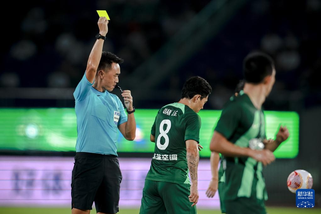 9月13日,主裁判杜健鑫(左)在比赛中向浙江队球员钱杰给(中)出示黄牌。新华社记者 江汉 摄