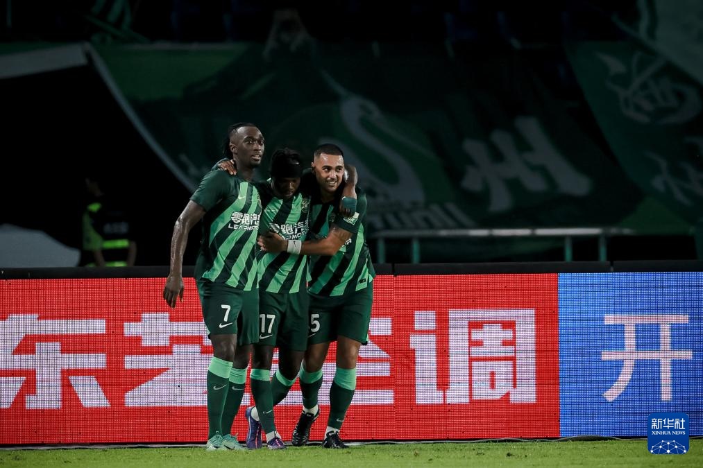 9月13日,浙江队球员埃弗拉(中)进球后与队友奥乌苏(左)、莱昂纳多庆祝。新华社记者 江汉 摄
