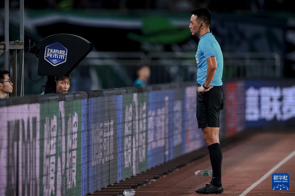 9月13日,主裁判杜健鑫通过VAR(视频助理裁判)回放观看浙江队补时阶段的进球。新华社记者 江汉 摄