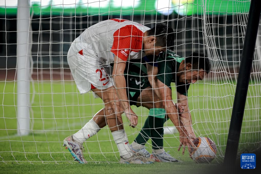 9月13日,浙江队球员孙国文(右)在比赛中进球后冲进球门捡球。新华社记者 江汉 摄