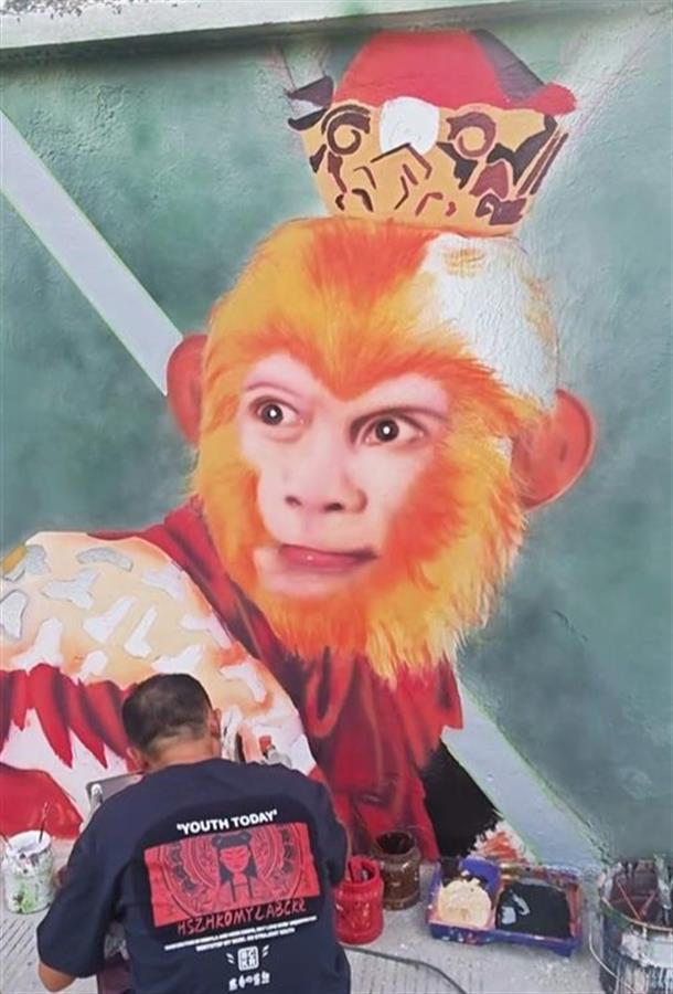 曹伟今年34岁,出生于江苏省泰州市医药高新区(高港区)许庄街道曹官营社区,从事壁画行业已有8年时间。近段时间,随着国产游戏《黑神话:悟空》爆火,曹伟看到国内不少墙绘爱好者将游戏中的角色画上了墙,吸引不少游客到现场打卡拍照,他也希望通过这种方式宣传自己的家乡。今年9月初,曹伟在家乡的一个农贸市场附近,发现一面长约近百米的白墙,周边没有居民区,因此他便和妻子合作,在这面白墙上作画。“一共画了四幅,分别是猪八戒与蜘蛛精、哪吒与杨戬、六小龄童饰演的孙悟空,还有一幅是歌手赵雷,从9月1日开始,前后画了八九天时间。”曹伟说,绘画期间,过路的人经常给他们送水,得到了路人的鼓励,还有不少游客也慕名前往打卡,“我知道的游客有从苏州、无锡、扬州、常州赶来的,最远的还有河南和山东的,高峰时期超过200人。”