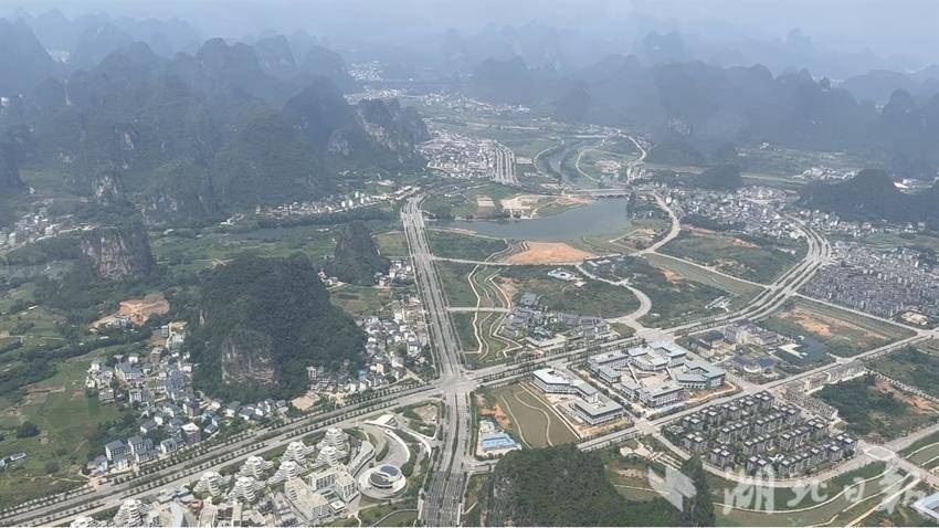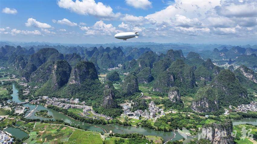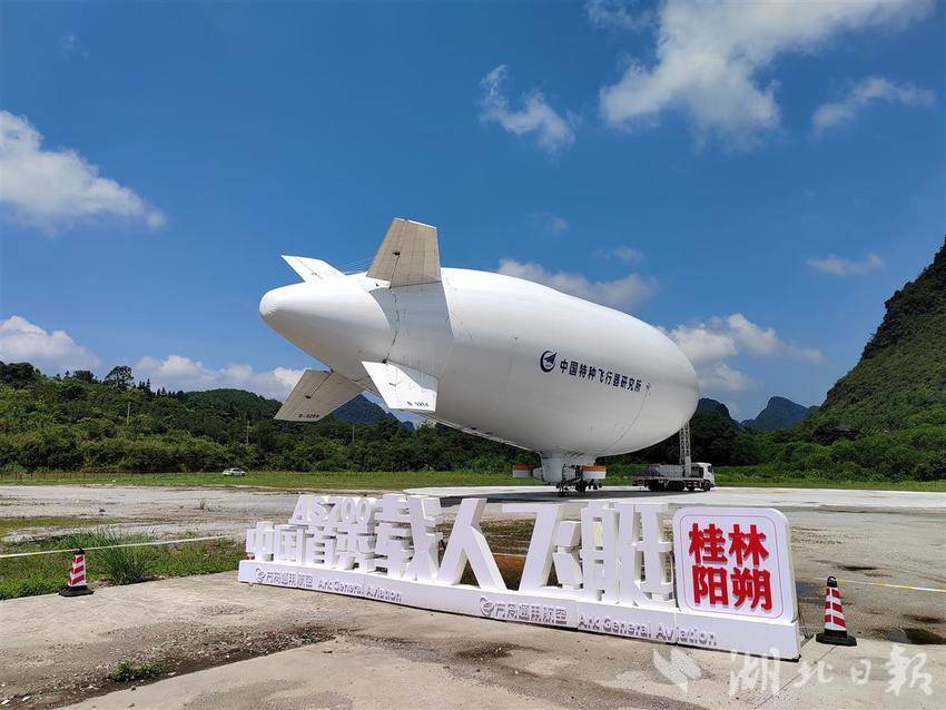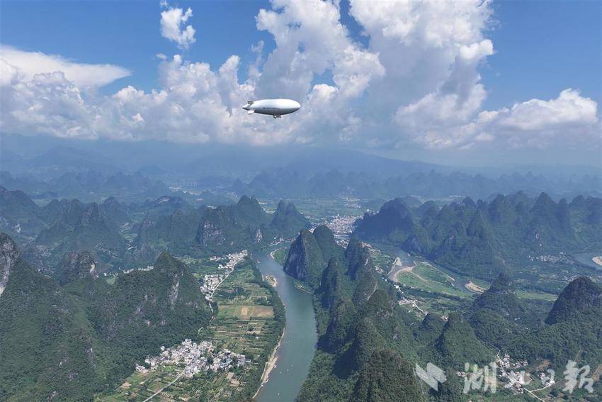 9月13日,湖北日报全媒记者从桂林市阳朔县新城区出发,前往试乘体验“祥云”AS700载人飞艇。