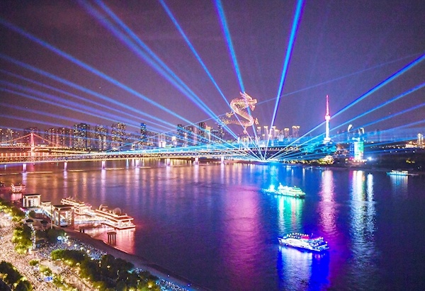 当晚,武汉长江大桥与长江二桥间的水岸线上,楼宇、桥体、船只及趸船码头等都化作了光影幕布,由长江二桥领衔,绚丽的光影倒计时在楼宇上跃动——13、12、11、10……倒计时数字与十三省区市的名称一起,带动两江四岸共同闪烁。