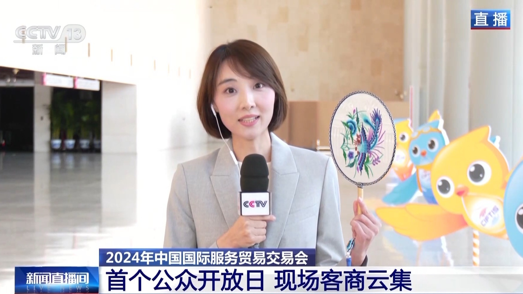 不仅如此,还有展商在现场发礼品,这把扇子就是在现场领取的中秋礼品。它是一把非遗苗绣团扇,团扇寓意平安、团圆,希望每一个领取到它的人,都能带着这份好运,与家人过一个团圆美满的中秋佳节。