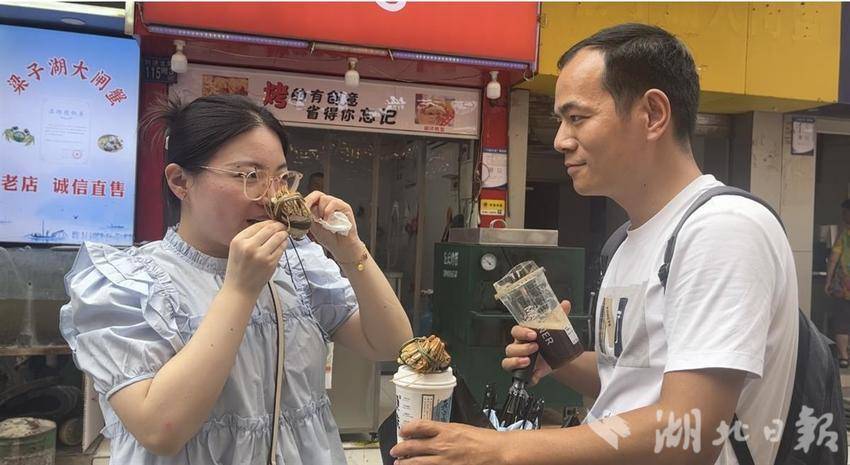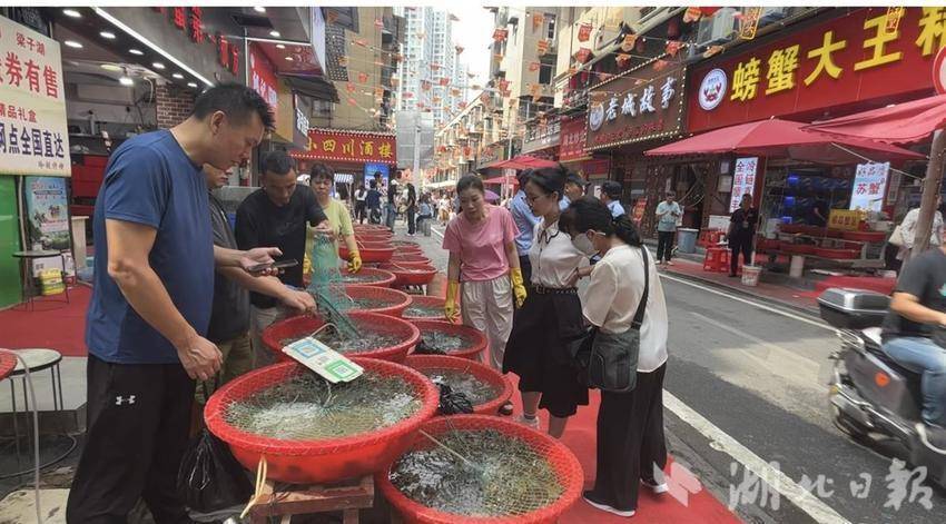 在街道一旁的螃蟹试吃品鉴区,前来体验的消费者排起长队,依次领取蒸熟的螃蟹。“螃蟹真的太香了,闻着就好吃。”得知今天有开街活动,武汉市民阮女士和丈夫一大早从家赶来。品尝过后,当场下单了8只六月黄螃蟹。