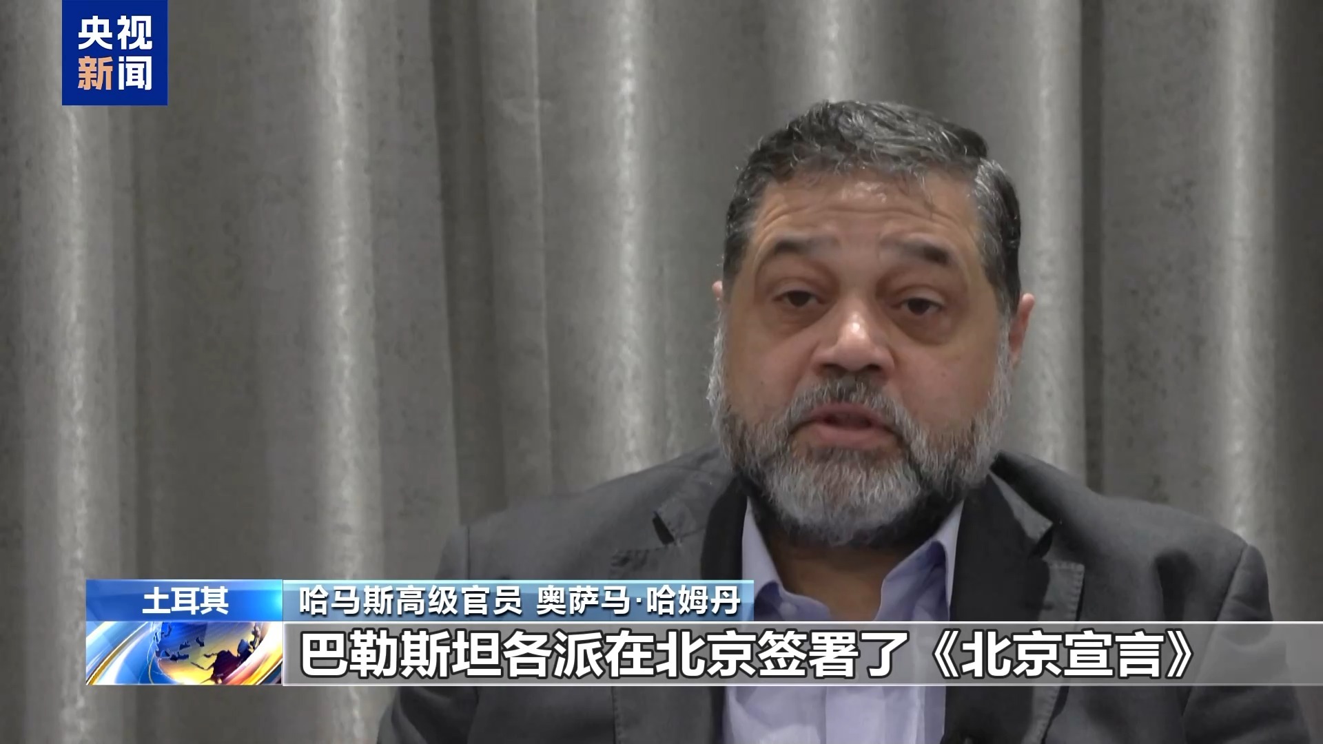 哈马斯高级官员 奥萨马·哈姆丹:巴勒斯坦各派在北京签署了《北京宣言》,同意组建临时民族和解政府,对加沙和约旦河西岸进行有效管控。以色列试图将约旦河西岸和加沙地带分裂开来,这不是我们想要的,也不会同意。