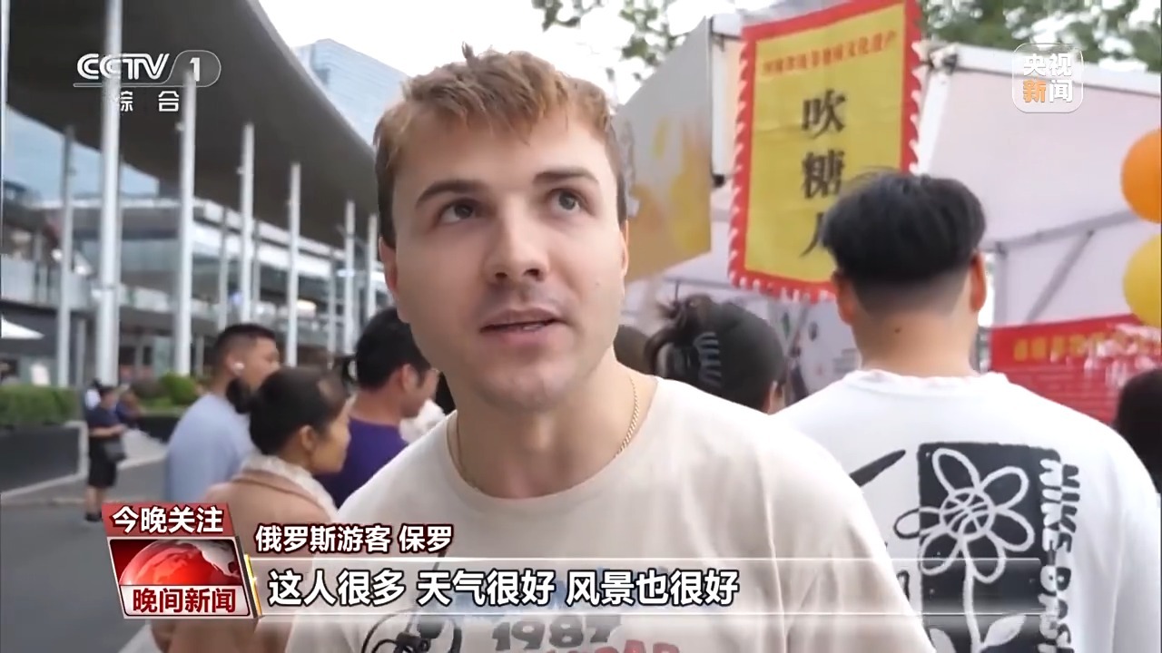 俄罗斯游客 保罗:这人很多,天气很好,风景也很好。这里的食物看起来很好吃,但我还没尝试,我准备试一下吹糖人,我觉得看起来很好吃。