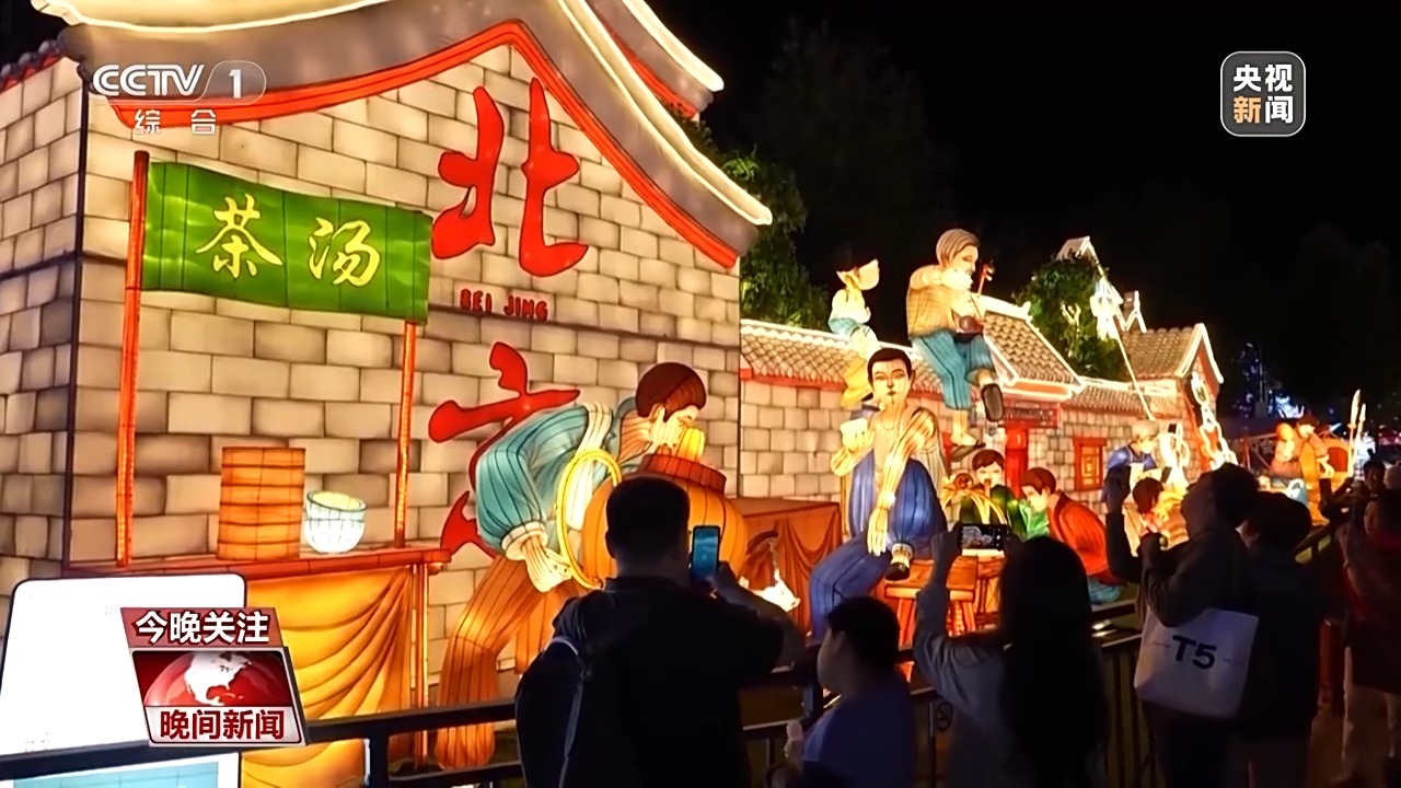 总台记者 李伟:这次京彩灯会,是自贡花灯这项非遗技艺跟北京文化的一次融合和创新。比如这组叫做“北京风物”的彩灯,不仅可以看到像风筝、糖人儿、胡同、二胡这样典型的北京元素,也有新北京的时代风貌。