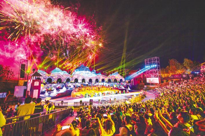 9月16日晚,武汉花博汇景区内灯火璀璨,主题烟花秀、火把巡游、篝火晚会及火棍武术、火壶表演、打铁花等特色鲜明的“火秀”特技给游人带来一场视觉盛宴,现场人气火爆。