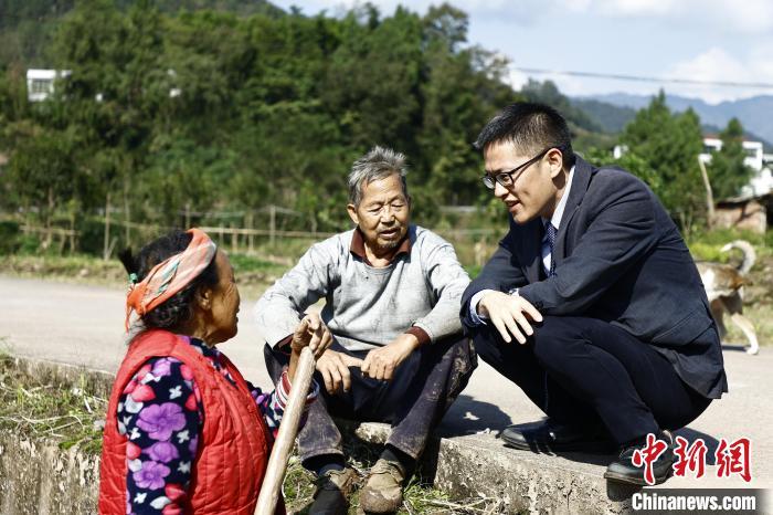 向勇(右一)与毕城村村民交谈。(受访者供图)