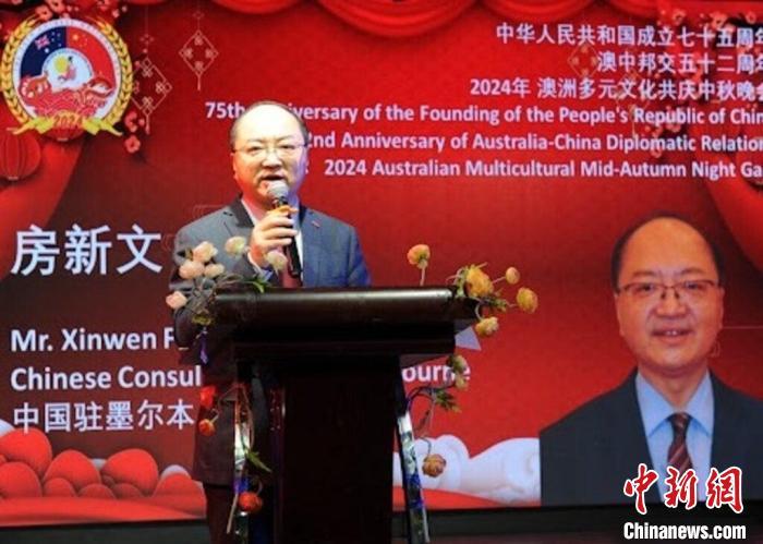 当地时间9月8日,为庆祝中华人民共和国成立75周年、澳中建交52周年,并欢度传统中秋佳节,澳大利亚维多利亚州(简称维州)的华侨华人在墨尔本举办了一场盛大的庆祝活动。中国驻墨尔本总领馆总领事房新文出席活动并致辞。(主办方供图)