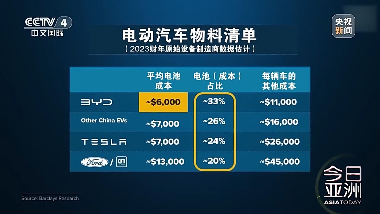 声音来源 美国汽车行业分析师 迈克尔·邓恩:比亚迪在自制汽车零部件方面表现出色,75%到80%的零部件都是由他们自己生产的。他们掌握了电池及其供应链,很明显这有助于降低成本、把控质量。