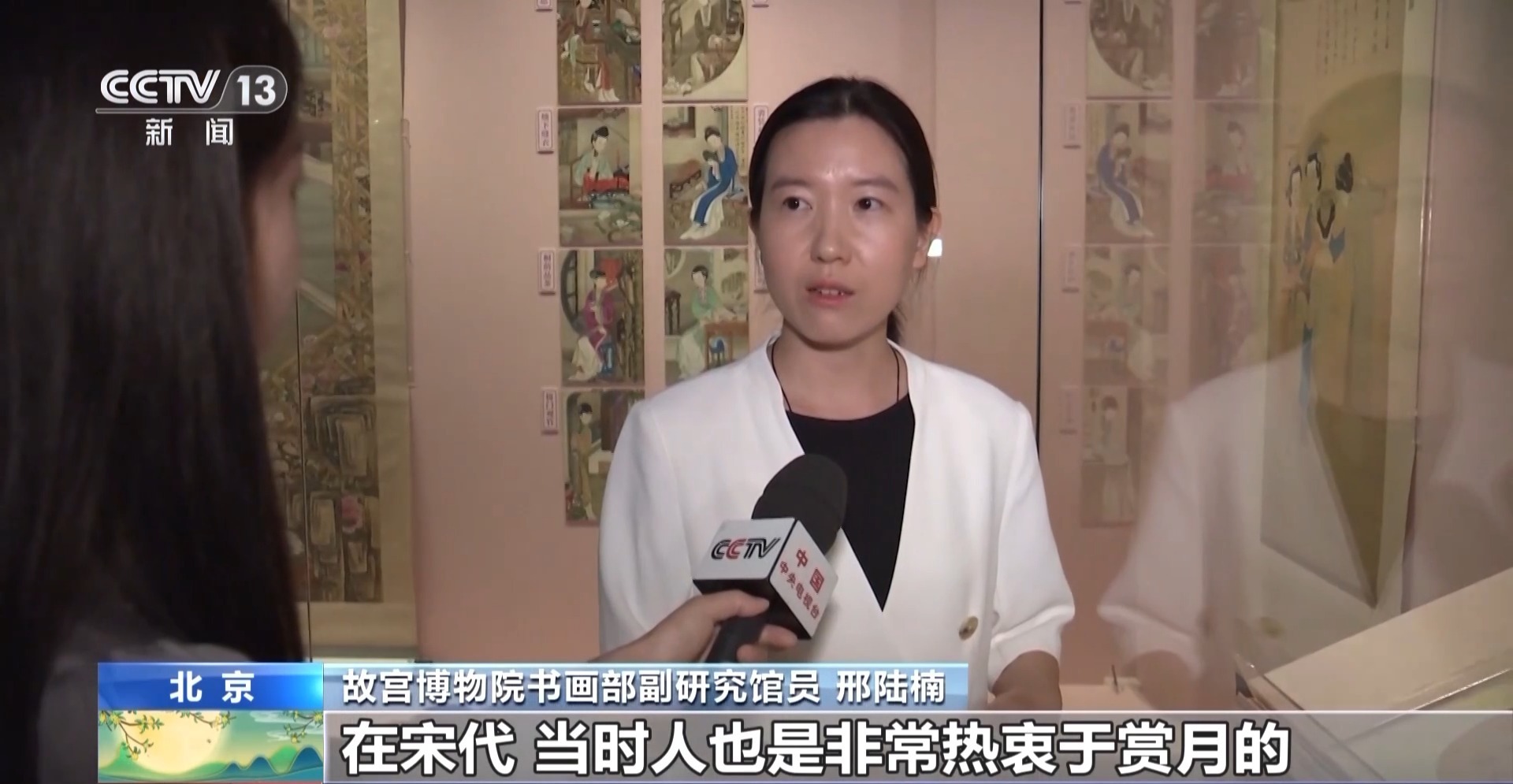 故宫博物院书画部副研究馆员 邢陆楠:它展示的是一年12个月跟节令比较相关的当时宫中女子的一些娱乐活动,第八件表现的就是中秋主题。