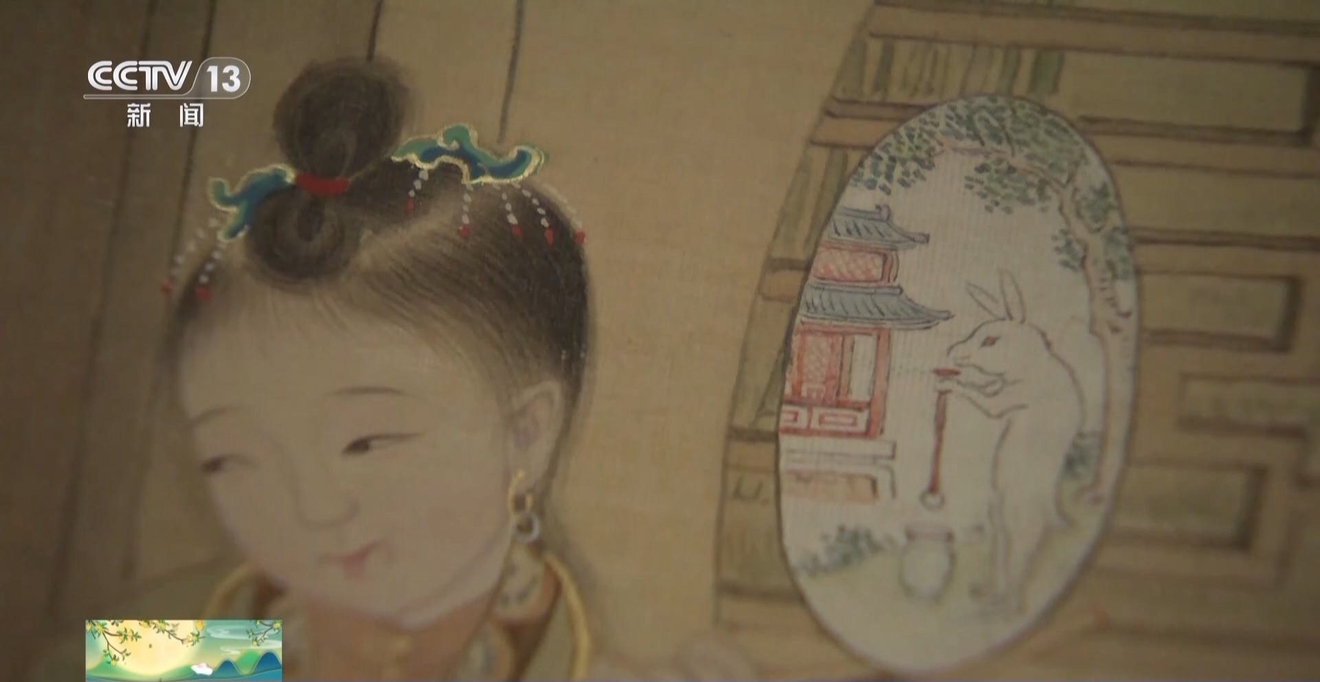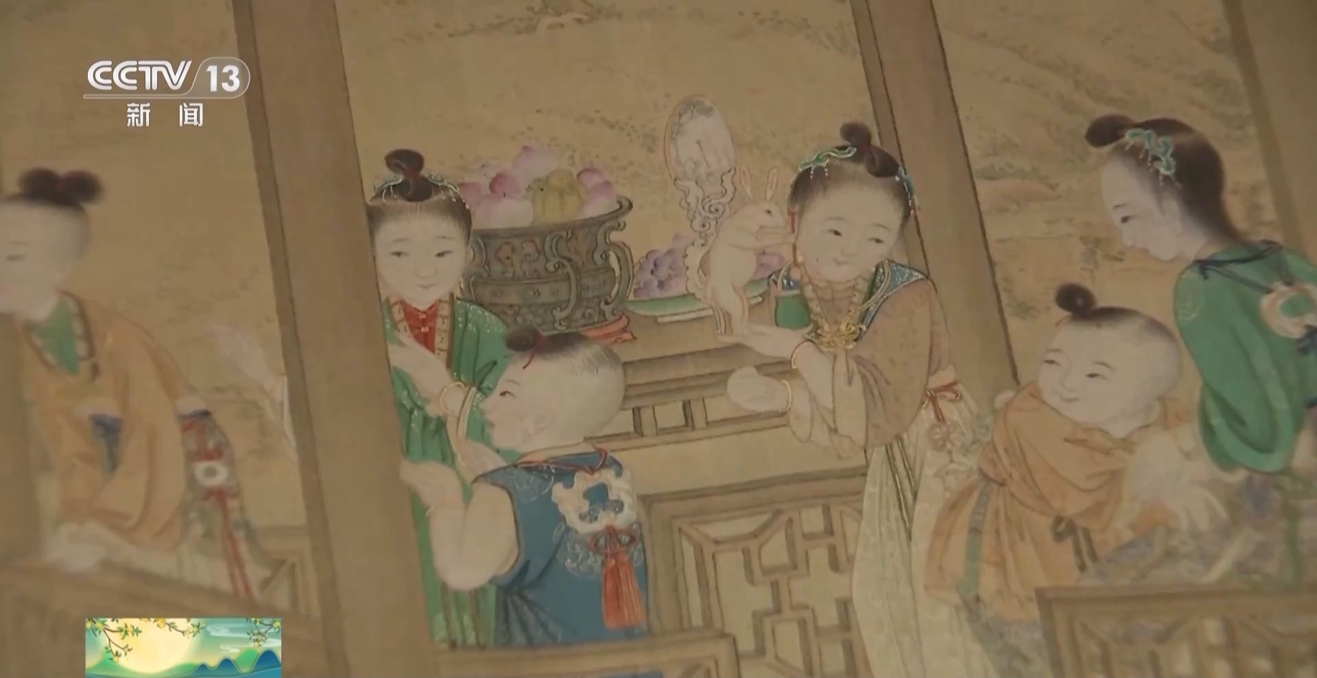 故宫博物院书画部副研究馆员 邢陆楠:画家在绘制的时候其实是非常用心的,他既还原了当时民间包括宫廷中这种拜月的习俗,也加入了很多喜庆、具有美好寓意的元素。