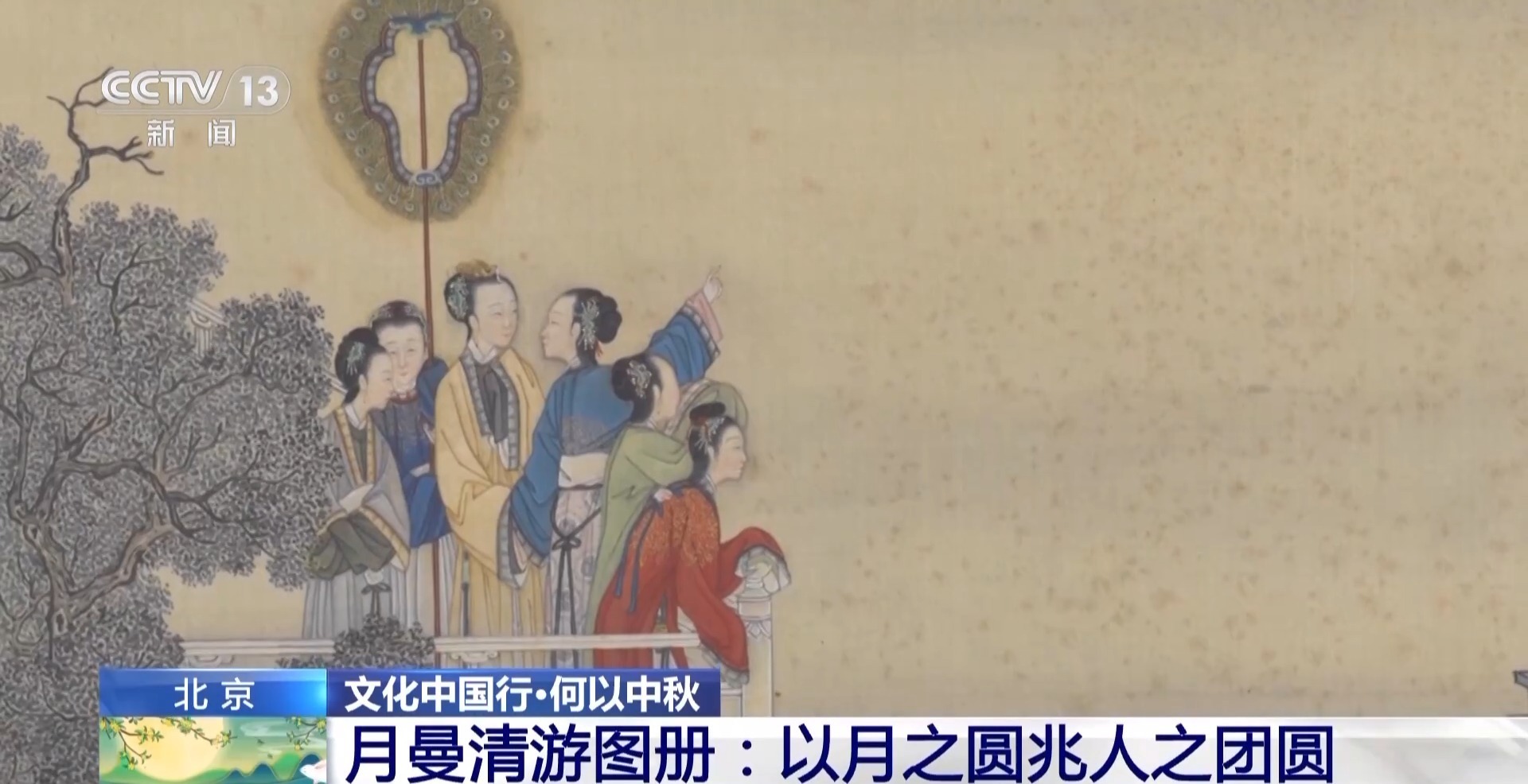 故宫博物院书画部副研究馆员 邢陆楠:这个图卷就是一个非常典型的中秋拜月的场景,出自清代中期宫廷画家之手。通过众多的仕女孩童的形象以及他们娱乐嬉戏的活动,非常完美展现了中秋佳节大家团聚在一起的这种欢愉的氛围。