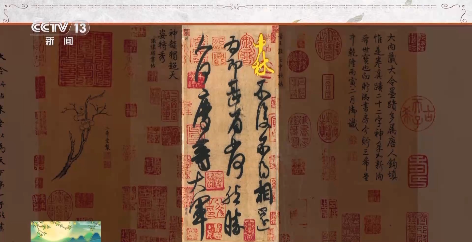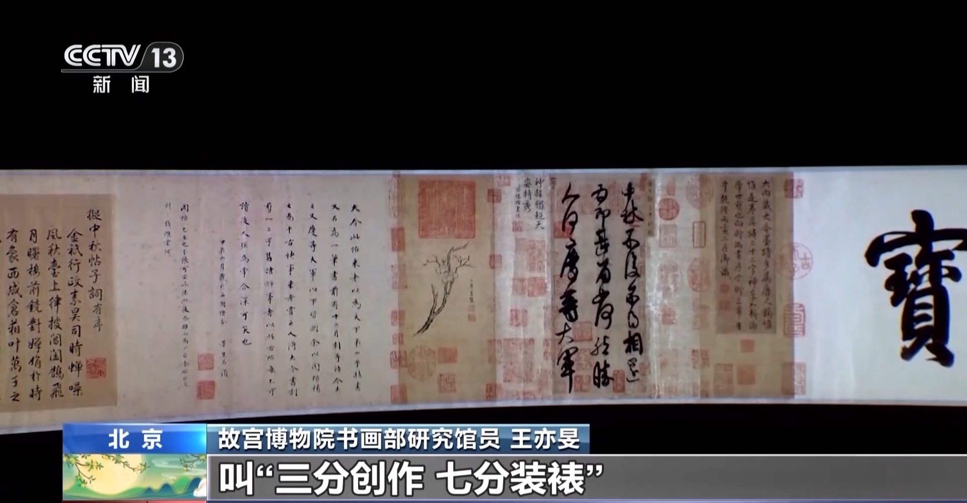 故宫博物院书画部研究馆员 王亦旻:这是中国特有的一种装潢形式,叫“三分创作,七分装裱”,通过装潢形式呈现出它最好的状态。中间这一块是核心的,它的两边是装饰性的隔水,再往外是两个副隔水,今天的这个样子,是清朝乾隆时期完成的装裱样式。