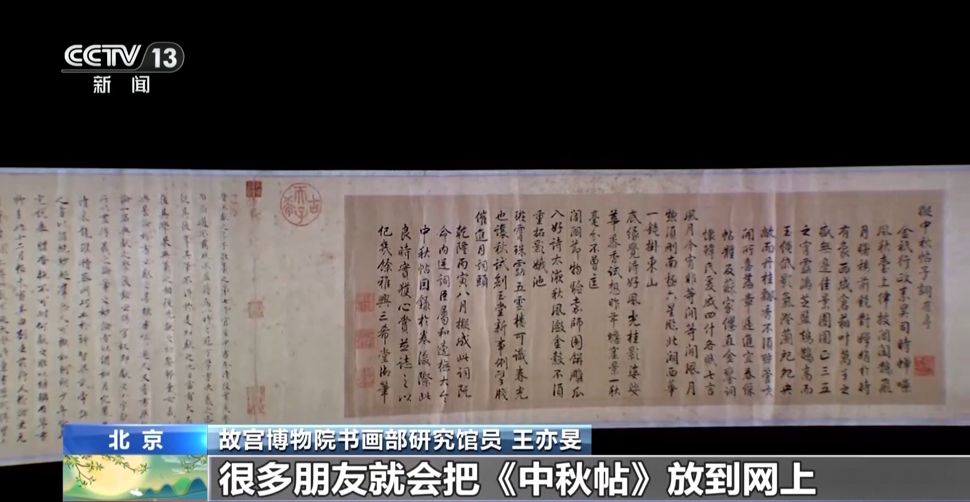 故宫博物院书画部研究馆员 王亦旻:利用《中秋帖》形成一种中秋时节的文化活动也好,文化展示也好,是始于乾隆皇帝。