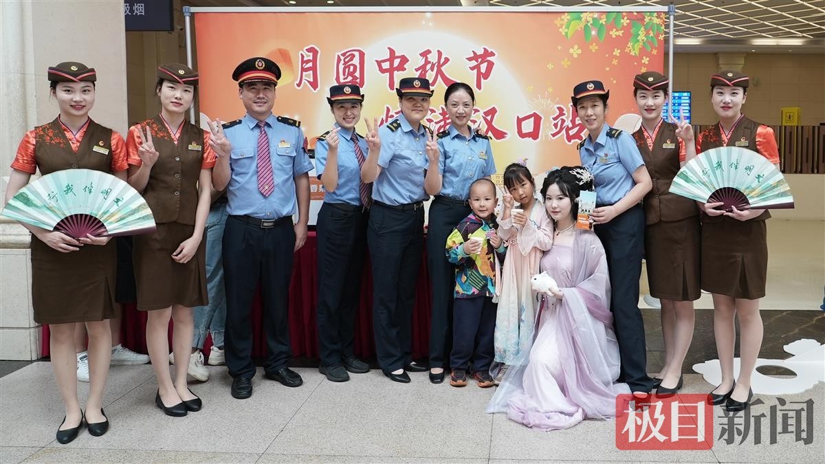 今年中秋节,汉口火车站在二层候车区开展了“月圆中秋节,情满汉口站”文明出行主题活动,为候车的旅客免费提供百香果茶、菊花茶、玫瑰茶等饮品。中秋主题拍照展板吸引了许多旅客打卡留念。