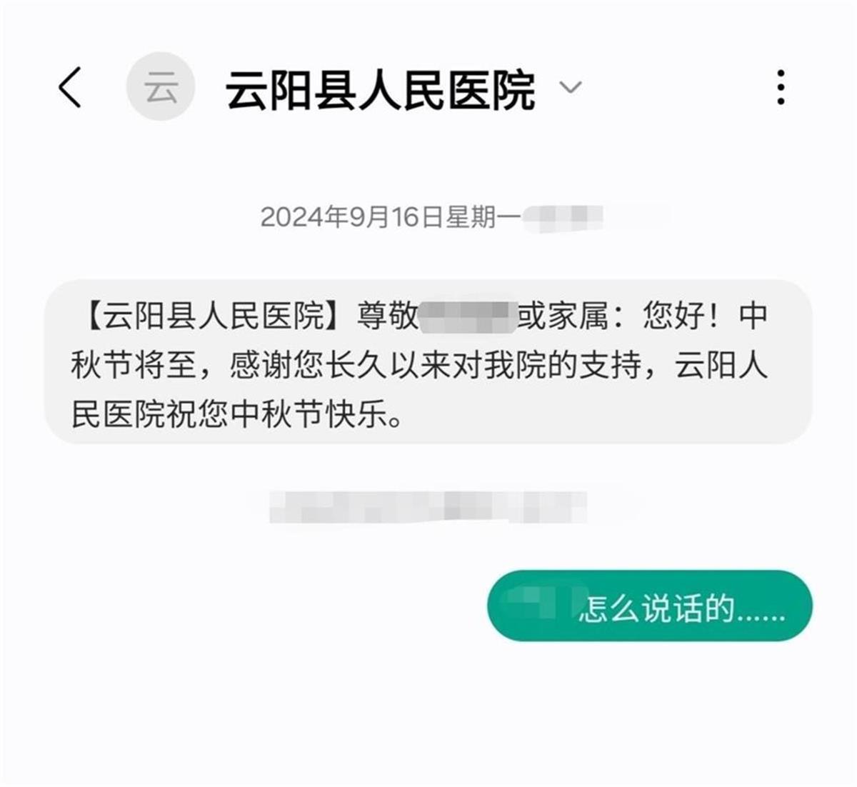 近日,多名重庆网友反映,自己收到了云阳县人民医院的短信:“中秋节将至,感谢您长久以来对我院的支持,云阳人民医院祝您中秋节快乐。”部分网友吐槽说,该院用词不妥,收到短信后感觉不太舒服,对此,该医院工作人员回应称,因医院病人随访系统出现问题,大规模发布系统自带的模板信息,给广大机主带来困扰,深表歉意。(据9月17日极目新闻报道)