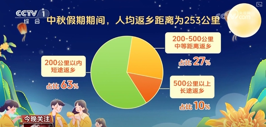 中国移动梧桐大数据统计显示,中秋假期期间,人均返乡距离为253公里,200公里以内的短途返乡人员占比为63%,短途返乡人群成为2024年中秋假期返乡主力军。