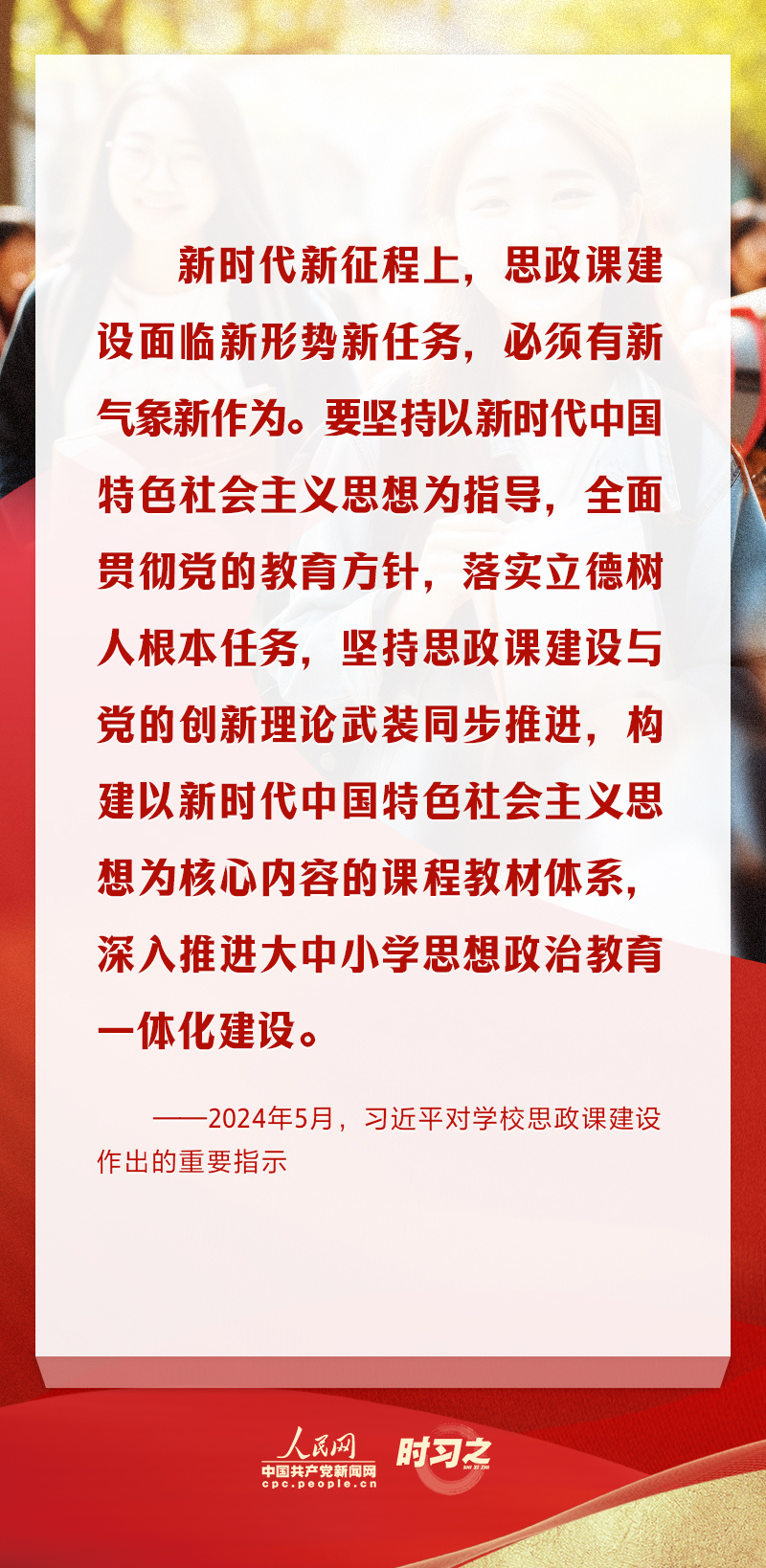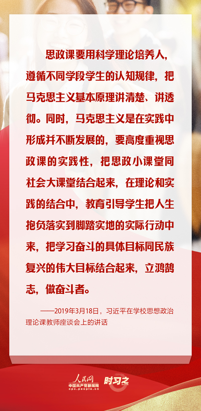 思想政治理论课是落实立德树人根本任务的关键课程,也是培养一代又一代社会主义建设者和接班人的重要保障。长期以来,习近平总书记一直心系思政教育工作,并多次强调要重视思政课的实践性,把思政小课堂同社会大课堂结合起来,教育引导学生立鸿鹄志,做奋斗者。