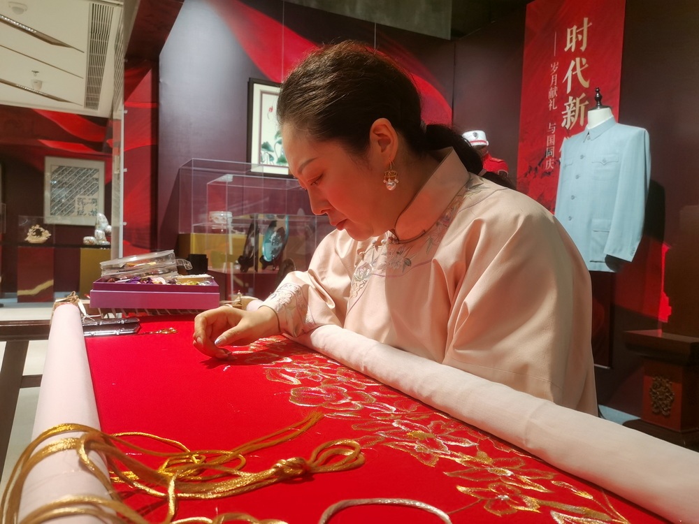 国家级非物质文化遗产代表性项目京绣区级代表性传承人毕红现场刺绣 中国经济网记者魏金金/摄