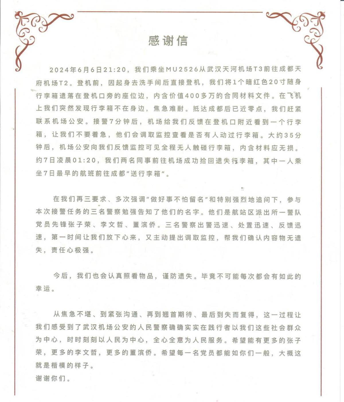 因找到行李箱,特殊物品无遗失,孙先生于9月10日从四川省成都市寄来一面锦旗。近日,湖北机场公安航站区派出所民警收到锦旗,打开一看,发现锦旗上写满了字,民警一数,仅致谢内容就有39个字。