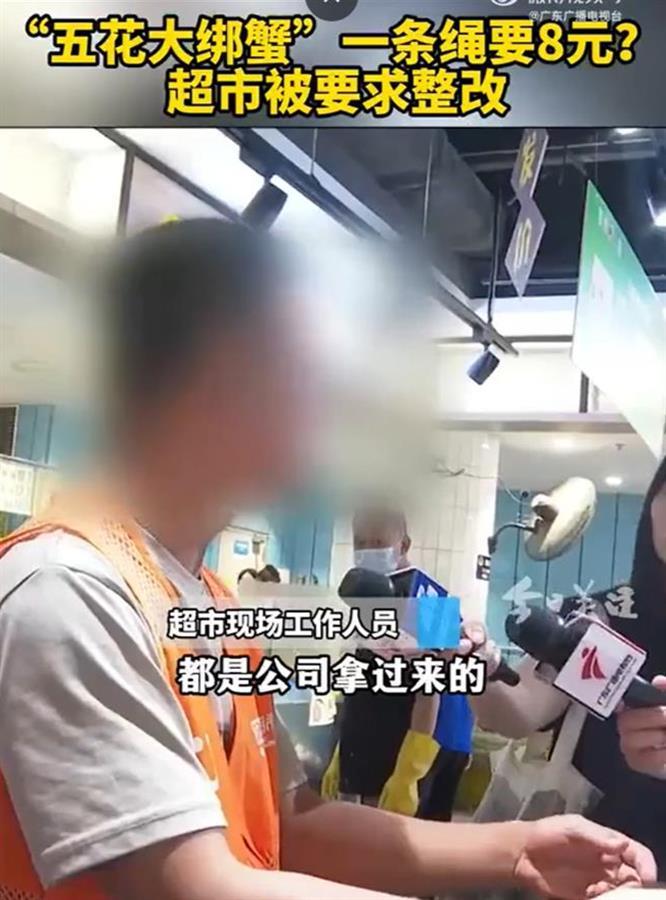 60元买螃蟹,20元买绳子?近日,广州市民王先生报料称,自己在超市花了60多元购买了两只“五花大绑蟹”,回家一称发现一斤多重的螃蟹里,捆绑的绳子足足有二两六重,相当于20块钱买了两条绳子。9月18日,记者来到涉事超市,发现用来捆绑螃蟹的粗塑料绳具有一定吸水性。现场工作人员表示,来货螃蟹就是这么包着来的,之前售卖的都是用简易扎带绑住的,后续应该不再进这一批用粗绳绑的螃蟹。目前,涉事超市已按照市场监管部门要求对相关螃蟹进行下架整改,全部更换为简易扎带。