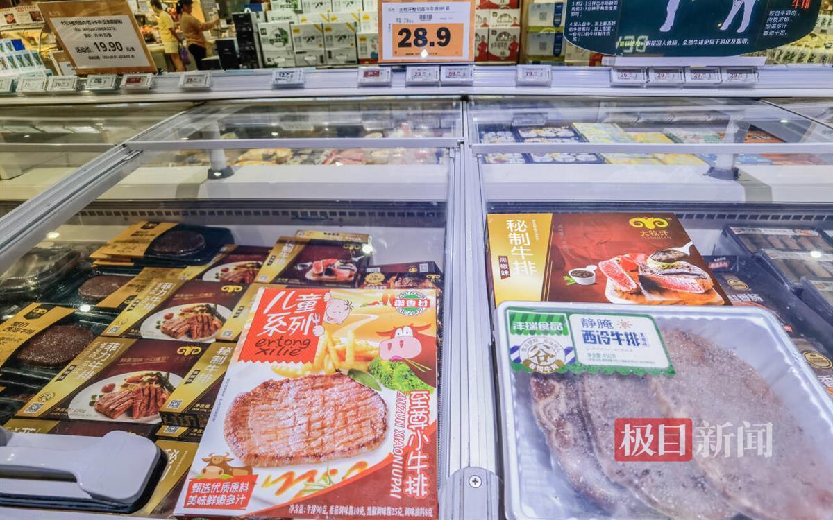 在武汉多家商超里,冰柜里的调理牛排比较常见。以武汉徐东某超市为例,调理牛排的品种大约有七八种,其中一袋两片装黑椒牛排售价27.7元,单片160克,单片售价13.85元。