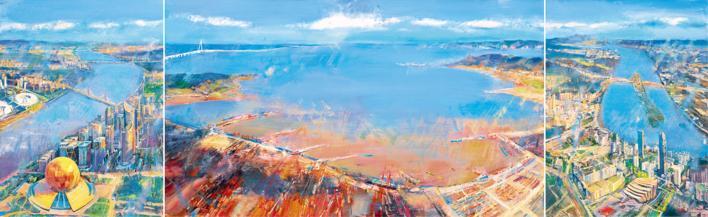 安徽艺术家方宇的布面油彩《东瞰·激流》,描绘现代长江港口繁忙景象,借助宏大的画面及细腻的笔触、富有动感的色彩,展现长江作为中国重要经济命脉的活力。江西艺术家谭丹武的综合材料作品《线性城市之双子塔》,以南昌标志性建筑为创作素材,加入动态装置,看起来既非常当代,又处处体现传统审美。中国美术学院教授杨参军、王乐其合作创作的油画《致蔚蓝——开展浙江海洋经济发展示范区建设》,以写实的手法,采取了多轴、多层次的方式来表现主题。