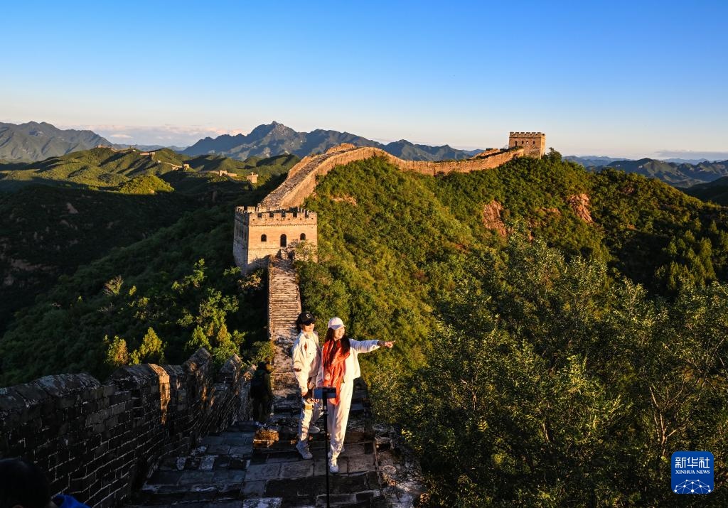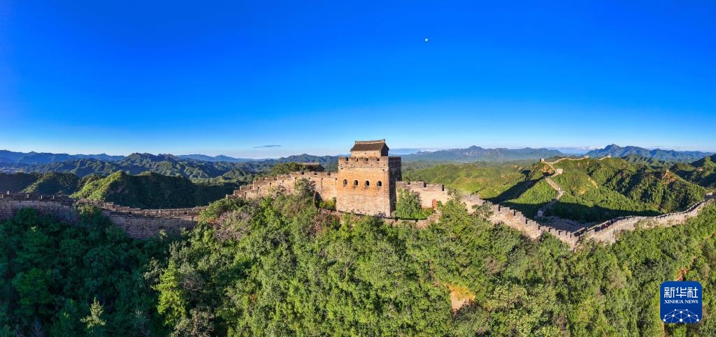 9月21日清晨,游客游览金山岭长城,月亮仍高高挂在长城上空。