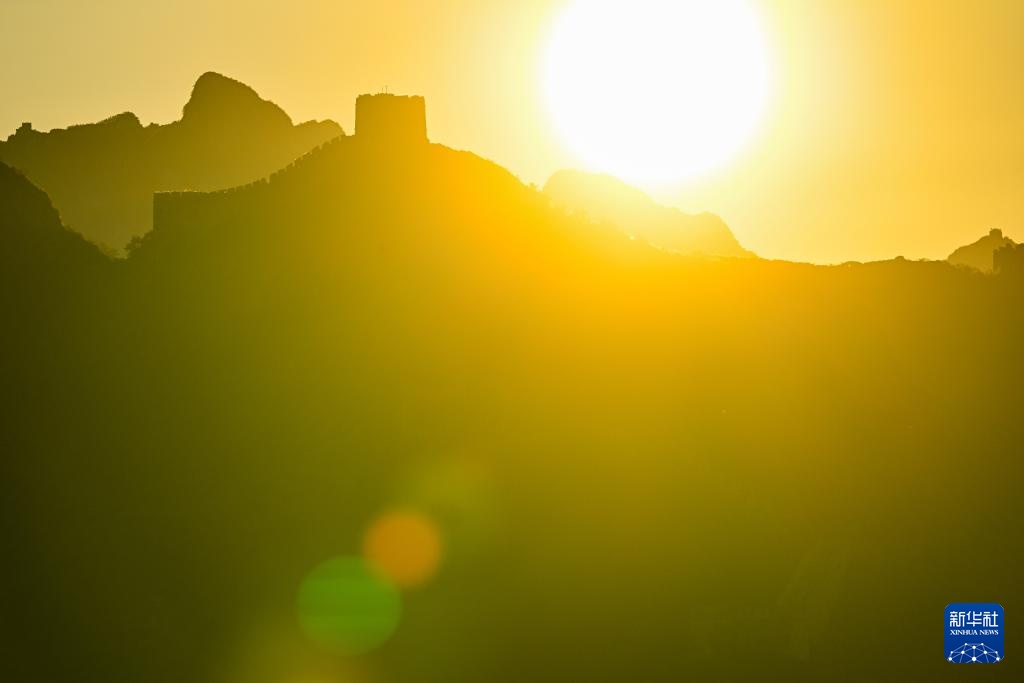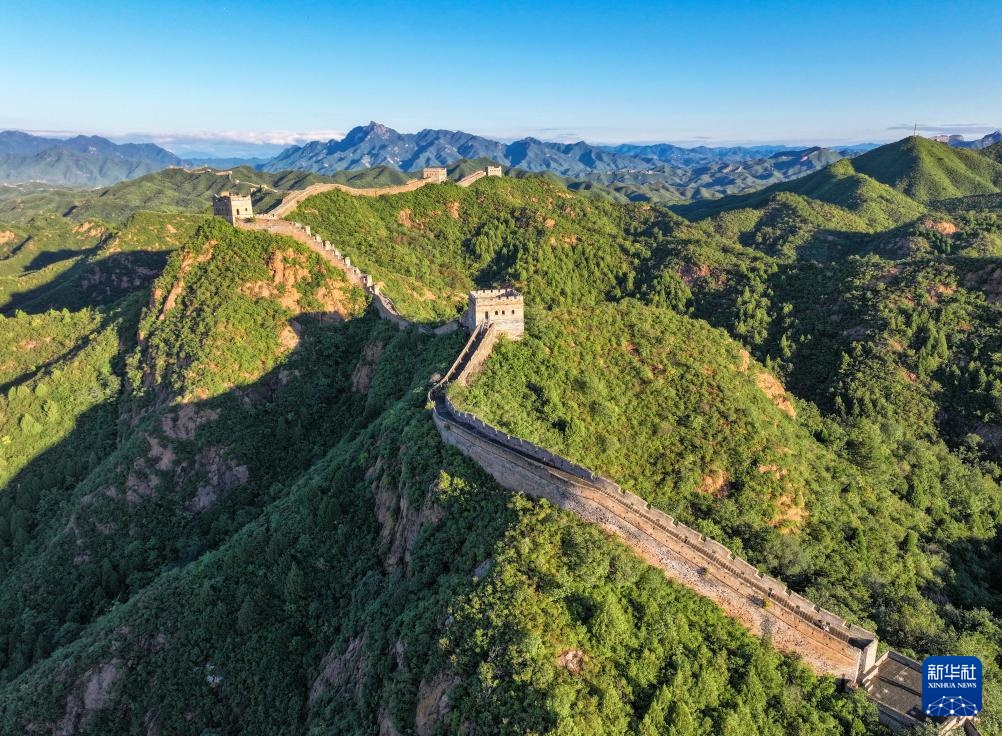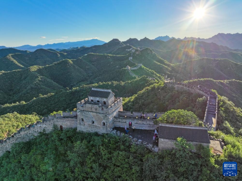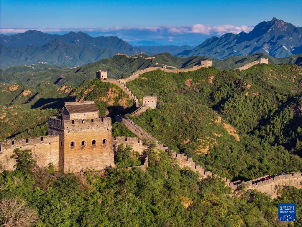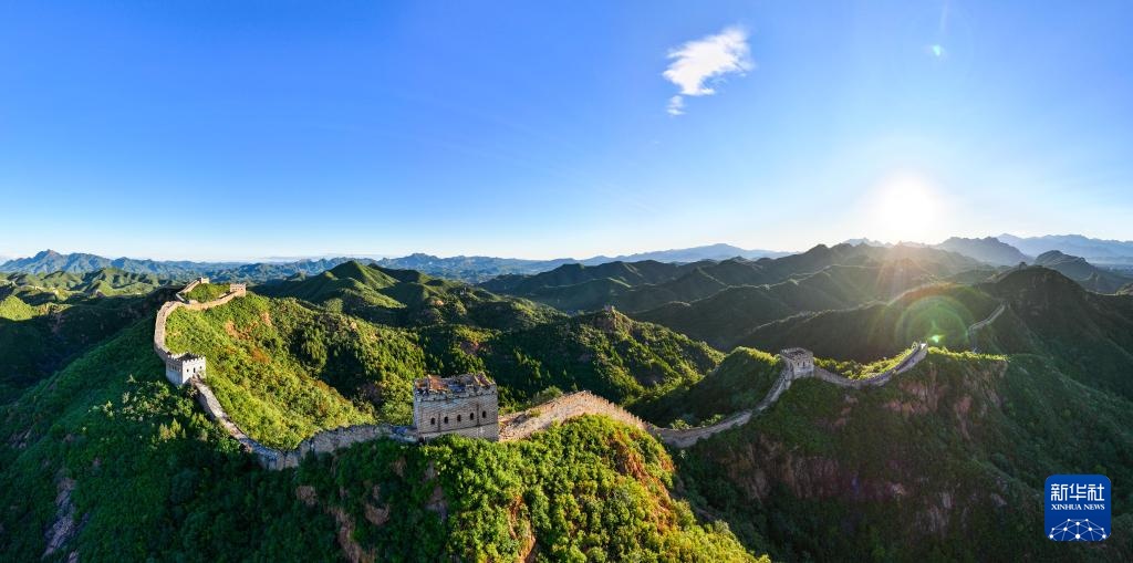 阳光洒在金山岭长城上(无人机全景照片,9月21日摄)。