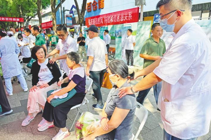 9月22日上午,“健康湖北”全省大型义诊活动周(江南片区)在武汉市武昌水果湖步行街举行。包括武汉大学人民医院、武汉大学中南医院、湖北省中医院在内的28家医疗卫生单位齐聚一堂,医疗机构纷纷派出多科顶级专家为市民免费看诊。