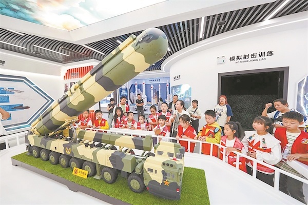 国防成就厅和射击训练体验场景最受大家的欢迎,国防成就厅摆放了一些装备模型(如图),因其外形逼真,做工精细,吸引不少小记者停下脚步拍照、打卡;模拟射击训练体验场景采用先进的红外线系统,搭配宽幅荧幕画面,超拟真音响特效,让参与者如置身其中。家长带着小记者们一起跟随屏幕指示,开展热火朝天的射击训练。