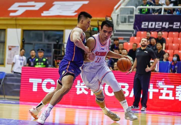 9月22日,在宁夏体育馆举行的2024-2025赛季中国男子篮球职业联赛(CBA)季前赛(银川站)南京队与四川队的比赛中,四川队队员杨文学(右)在组织进攻。新华社记者 杨植森 摄