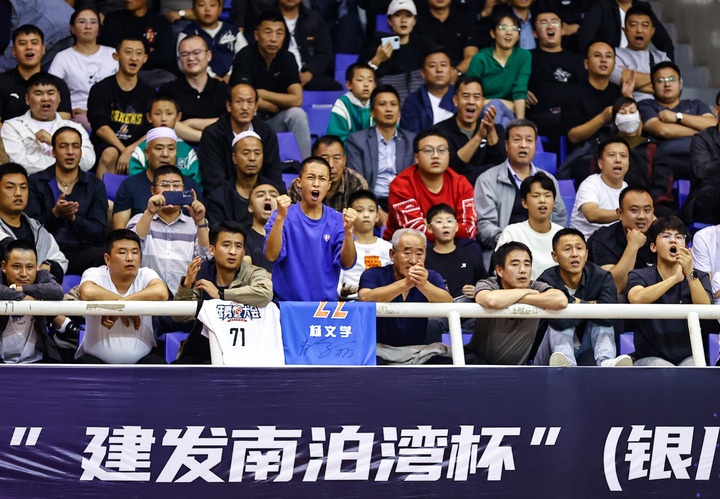 9月22日,在宁夏体育馆举行的2024-2025赛季中国男子篮球职业联赛(CBA)季前赛(银川站)南京队与四川队的比赛中,观众庆祝四川队队员杨文学得分。新华社记者 杨植森 摄