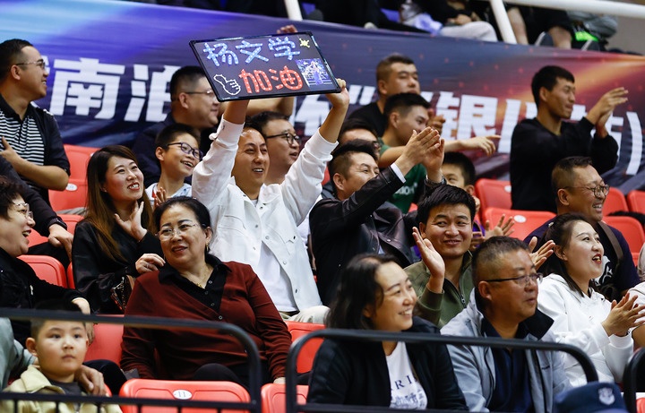 9月22日,在宁夏体育馆举行的2024-2025赛季中国男子篮球职业联赛(CBA)季前赛(银川站)南京队与四川队的比赛中,观众为四川队队员杨文学加油。新华社记者 杨植森 摄