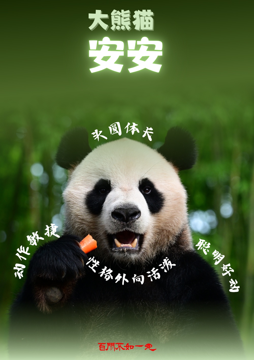 大熊猫“安安”,雄性,2019年6月出生,头圆体长,动作敏捷,聪明好动,性格外向活泼。