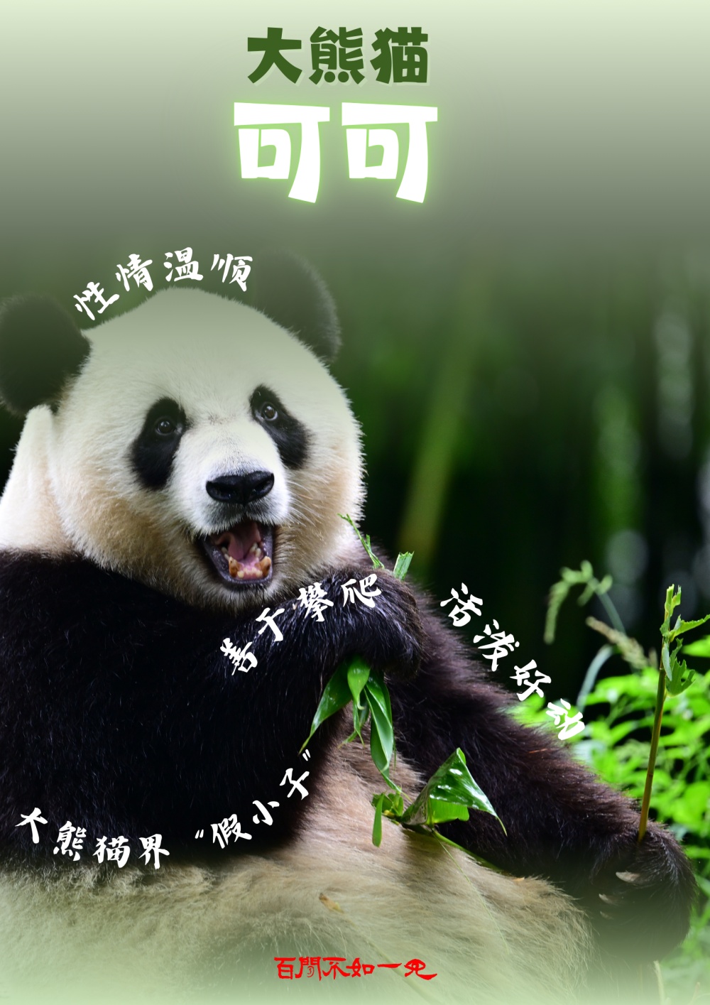 大熊猫“可可”,原名“甜可”,雌性,2019年6月出生,性情温顺、活波好动,善于攀爬,典型的大熊猫界“假小子”。