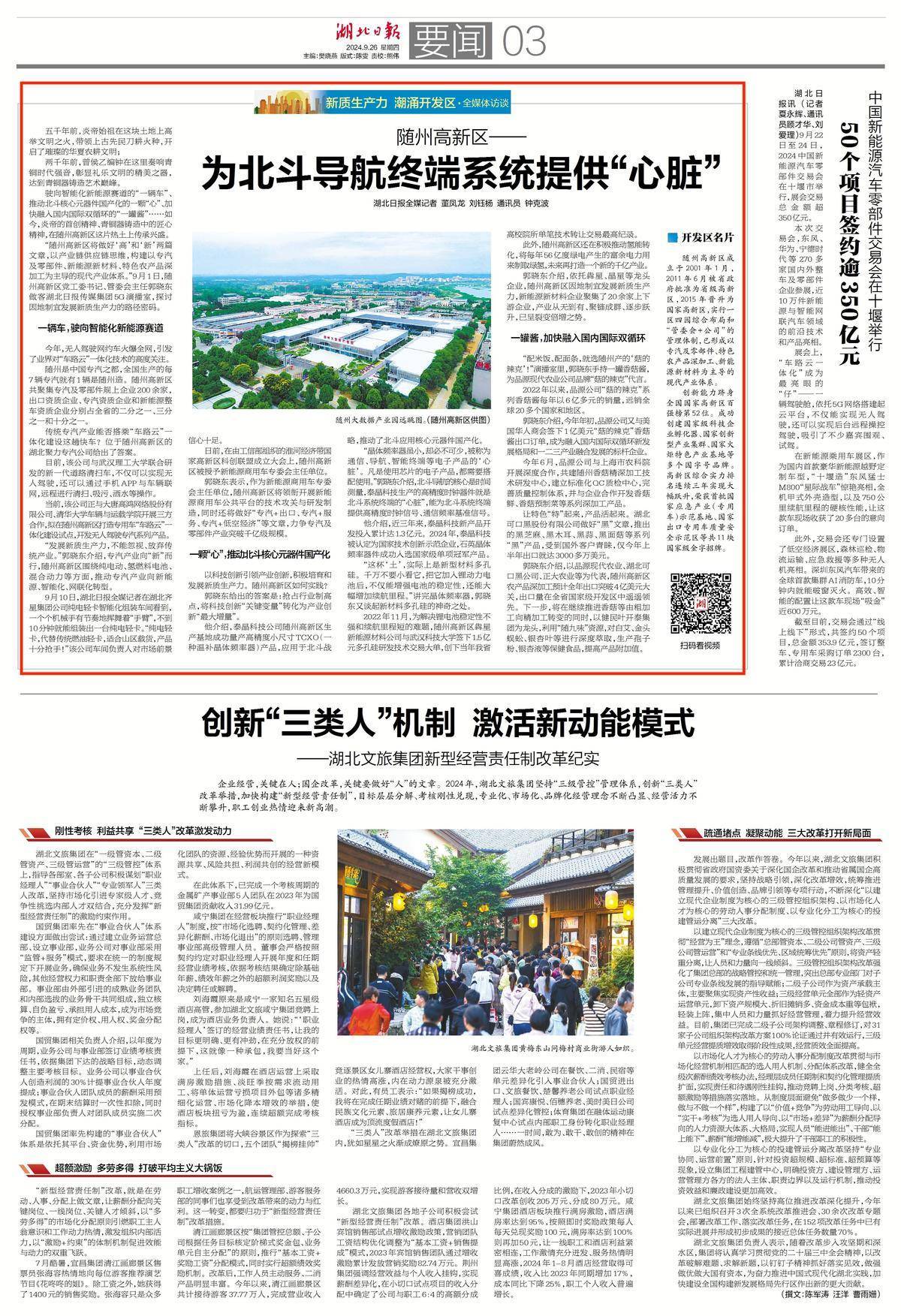 “随州高新区将做好‘高’和‘新’两篇文章,以产业链供应链思维,构建以专汽及零部件、新能源新材料、特色农产品深加工为主导的现代产业体系。”9月1日,随州高新区党工委书记、管委会主任郭晓东做客湖北日报传媒集团5G演播室,探讨因地制宜发展新质生产力的路径密码。