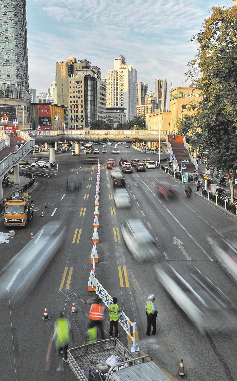 9月24日,施工人员在调试智能可变潮汐车道相关设备。 全媒体记者 谢勇 通讯员 梁政 摄