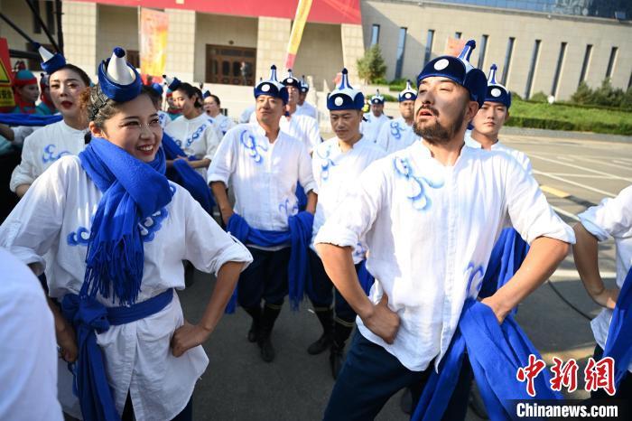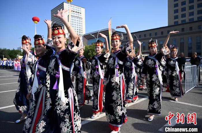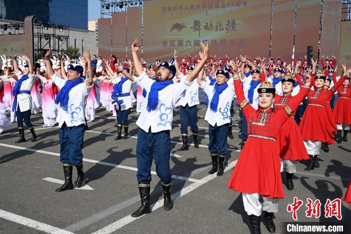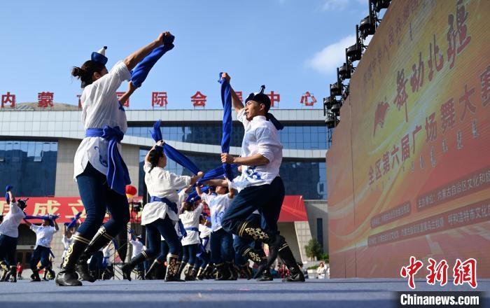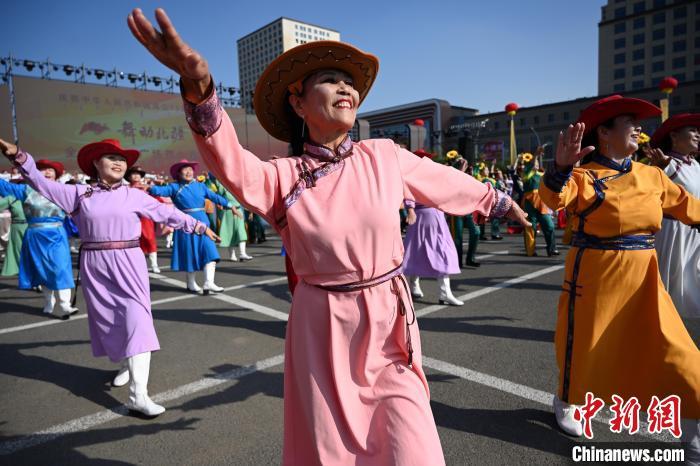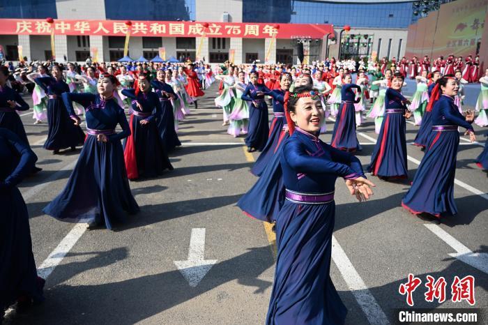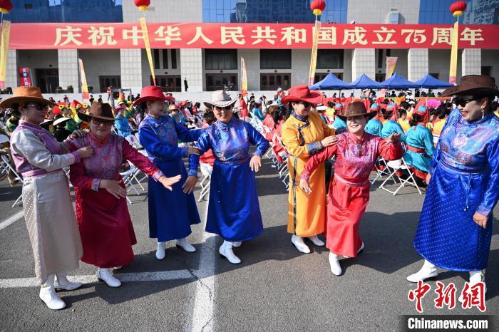 9月26日,内蒙古呼和浩特市,身着民族服装的舞者表演广场舞。当日,庆祝中华人民共和国成立75周年“舞动北疆”内蒙古自治区第六届广场舞大赛在呼和浩特市举行,来自各盟市的15支代表队、550余人以舞会友,尽展风采。中新社记者 刘文华 摄