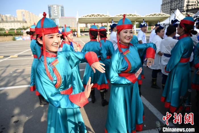 9月26日,内蒙古呼和浩特市,身着民族服装的舞者赛前热身。当日,庆祝中华人民共和国成立75周年“舞动北疆”内蒙古自治区第六届广场舞大赛在呼和浩特市举行,来自各盟市的15支代表队、550余人以舞会友,尽展风采。中新社记者 刘文华 摄
