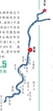 南水北调中线总干渠在邯郸境内全长80公里,途经6个县市区,共设6个分水口。供水范围包括邯郸市主城区和东部12个县(区),涉及人口800万。截至8月底,累计向邯郸市供水25.5亿立方米