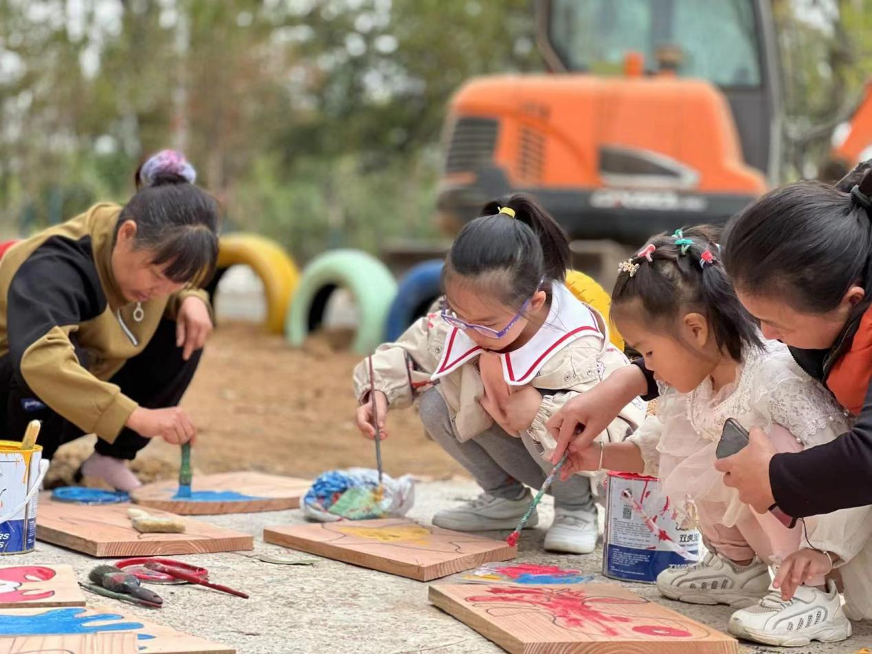 村民带着孩子为游乐设施涂上彩绘