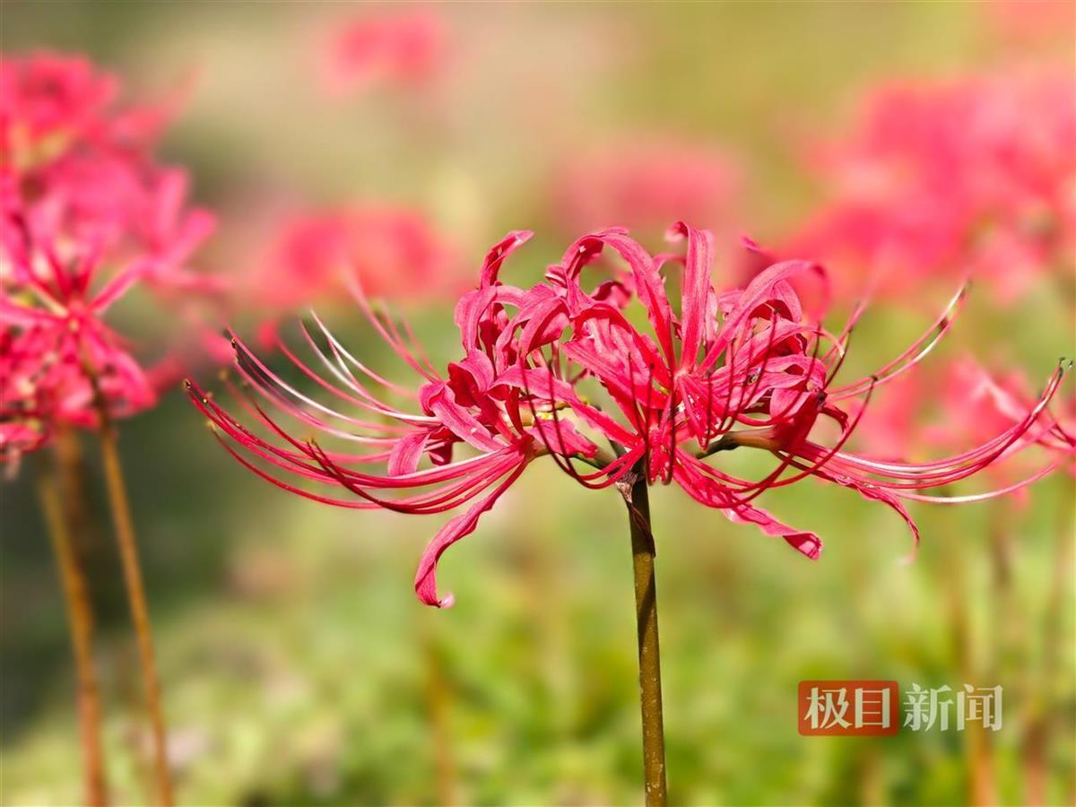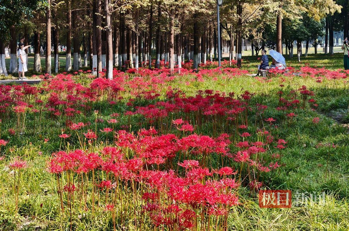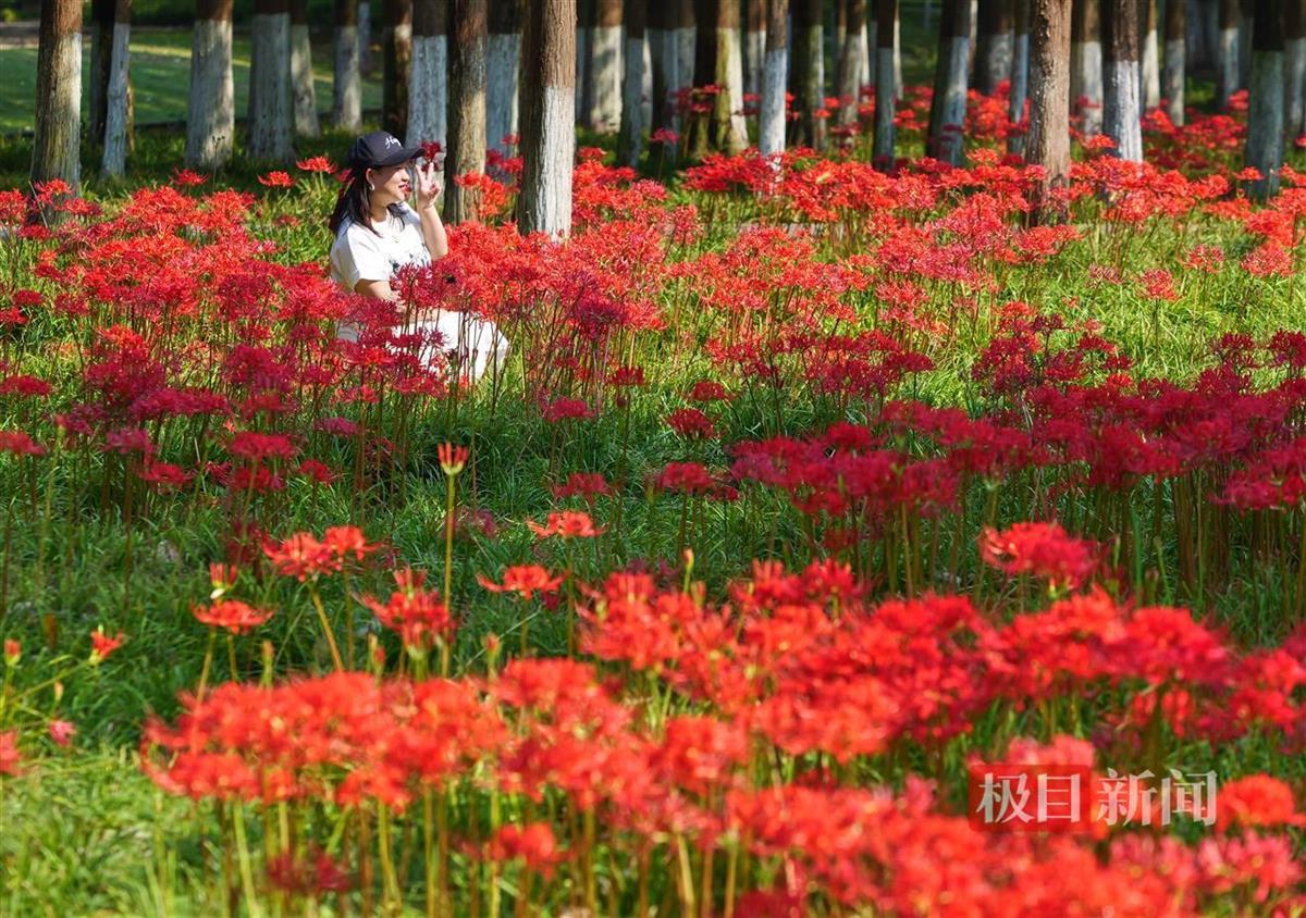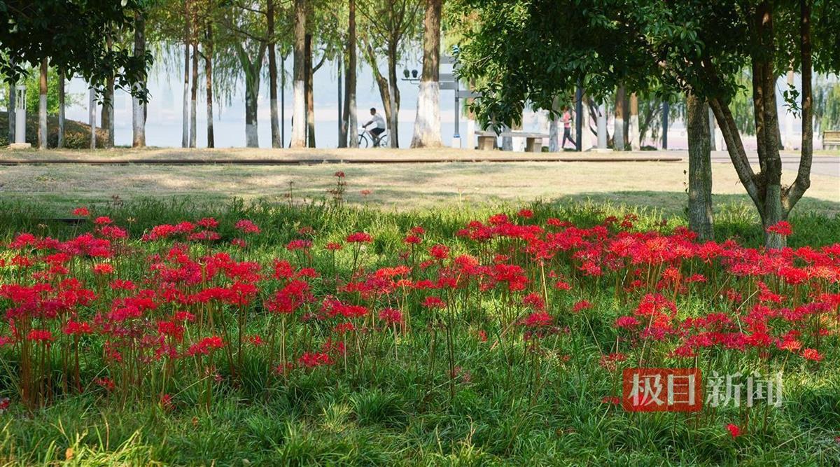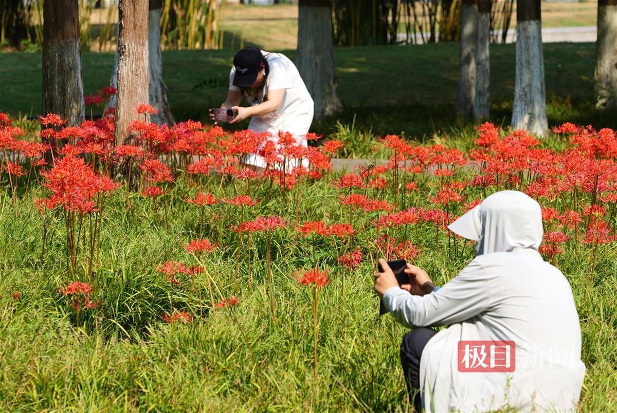 近日,武汉武昌江滩彼岸花盛放,吸引众多市民游客打卡拍照。9月27日,极目新闻记者在武昌江滩临近长江二桥的区域看到,成片的彼岸花在秋风中摇曳生姿,红艳如火,美不胜收。