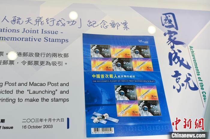 图为中国邮政、香港邮政及澳门邮电于2003年10月16日发行的“中国首次载人航天飞行成功”一套两款纪念邮票。中新网记者 李志华 摄