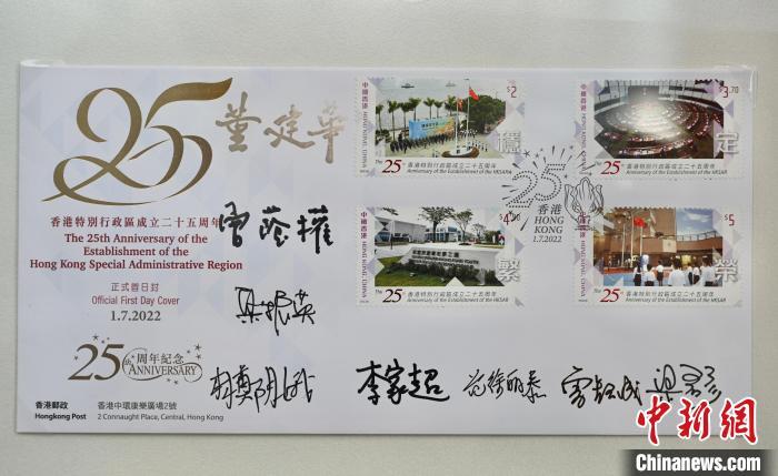 图为香港邮政展示“香港特区成立25周年”首日封上有历任及现任香港特区行政长官及立法会主席的签名。中新网记者 李志华 摄