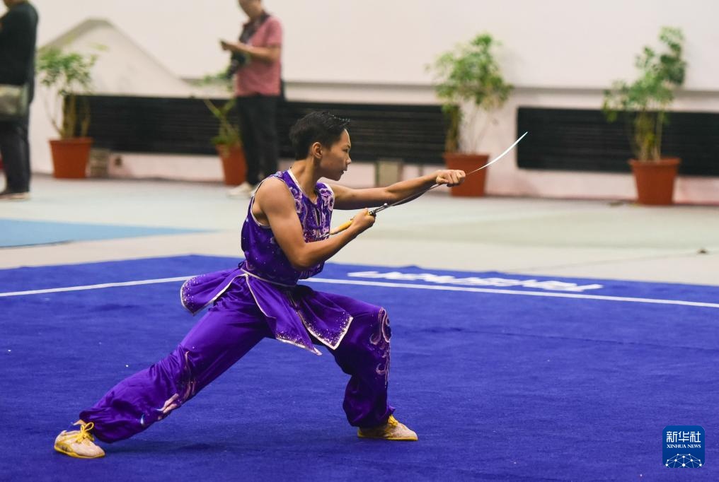 9月27日,中国队选手王逸轩在武术套路男子南刀B组比赛中。他以8.956分的成绩获得冠军。