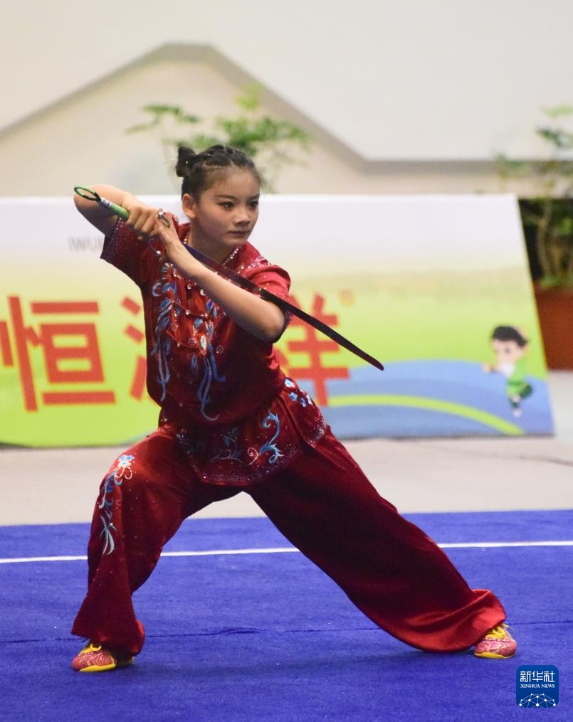 9月27日,中国队选手曹悦悦在武术套路女子南刀A组比赛中。她以9.233分的成绩获得冠军。
